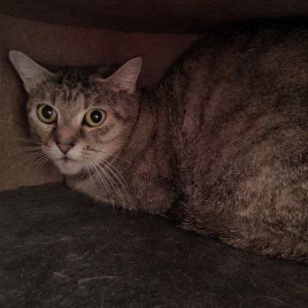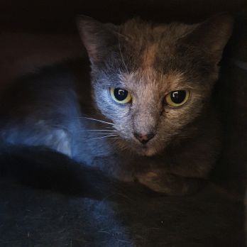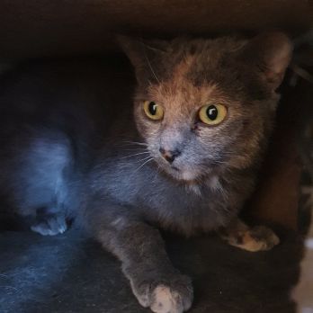 Delayla ist eine Schönheit, die Farbe nennt sich „Blue-Tortie“ und bezeichnet eine helle Schildpattfärbung: blaugrau und hellorange. Leider hatte man in Delaylas altem Zuhause keinen Blick für Parasiten, weswegen von ihrem wunderschönen Fell momentan nicht viel übrig ist. Dem wurde abgeholfen und nun wird sie bald wieder hübsch sein. Weil sie noch etwas schüchtern ist – oder vielleicht wegen der schütteren Haare? - traute sie sich aus der Kratzbaumhöhle für ein Foto nicht raus. Sie ist eine sehr liebe Katze, die dankbar das Köpfchen in die Hand drückt, wenn man sie krault. Beweist man etwas Durchhaltevermögen, rollt sie sich auch auf den Rücken und man darf ihr vorsichtig das Bäuchlein massieren. Delayla liegt gerne mit Luna zusammen in einer Höhle.